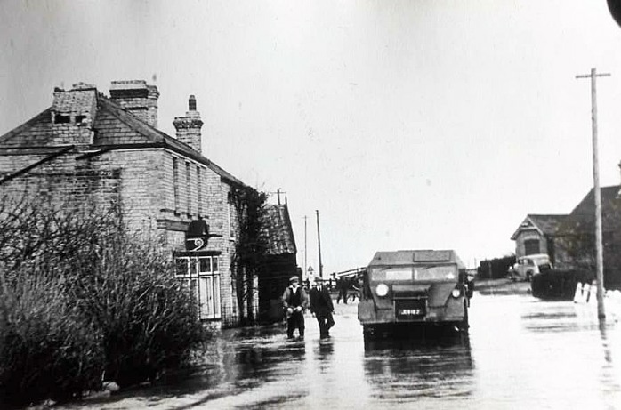 Flooded buildings opposite Earith boatyard (Hermitage Marina). The chimney stack collapsed in the gale.