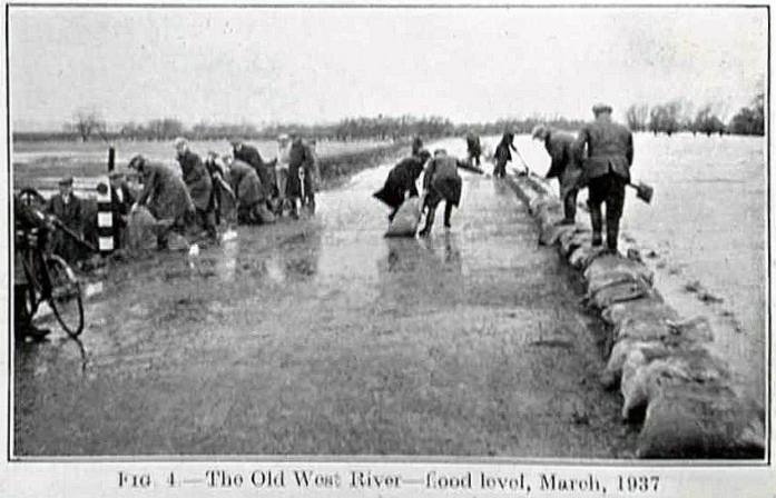 Ten years earlier almost to the day, men used sandbags in March 1937 to hold back flood water from the Old West River alongside the road from Willingham to Earith. This had been the meandering course to The Wash taken by the river Great Ouse before the two straight Bedford rivers had been dug from Earith to Denver Sluice in the 1630s and the 1650s.