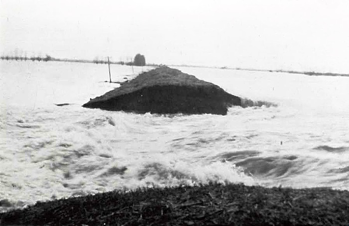 Looking towards Swavesey. River water rushes from right to left through the breach, down into Over Fen then far beyond.