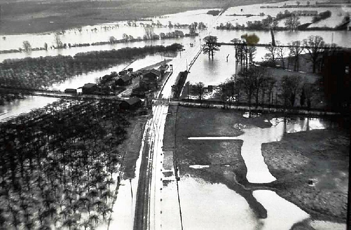 Swavesey station under water. Looking from St Ives along the railway track. Swavesey village is to the right and Over to the left. The bottom right quarter is the site of the former Swavesey Priory, probably already under construction by the time of the Domesday Book in 1086.